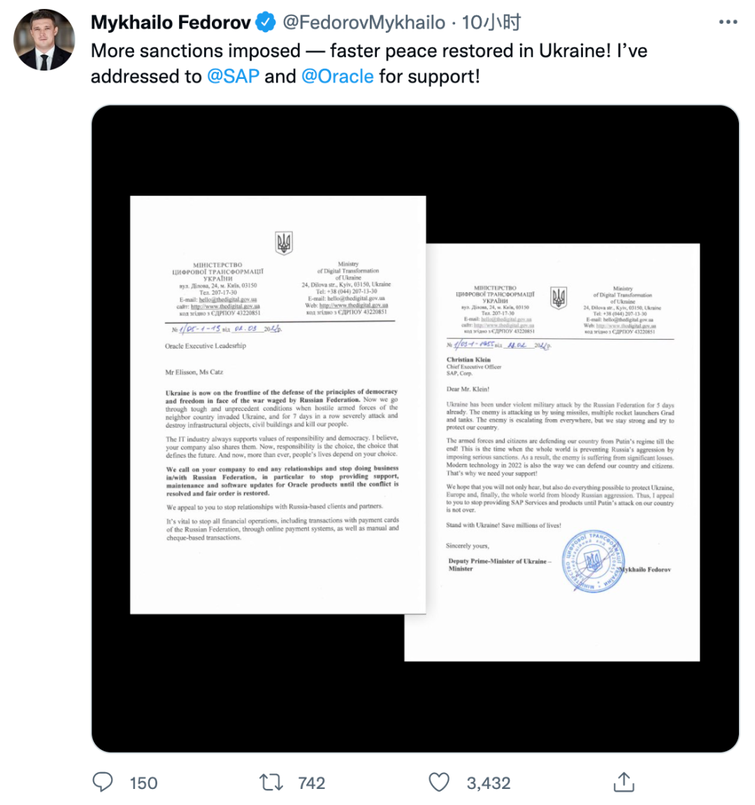 2022年3月2日,烏克蘭副總理兼數字化轉型部長Mykhailo Fedorov在推特上曬出了發給Oracle聯合創始人兼首席技術官Larry Ellison、Oracle首席執行官Safra Catz和SAP首席執行官Christian Klein的兩封信的副本。