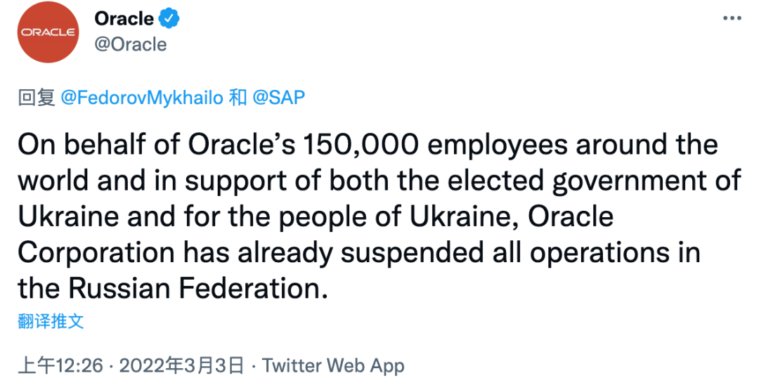 Oracle隨后發推文稱:“為了Oracle在全球各地的150000名員工的利益,為了支持烏克蘭民選政府和烏克蘭人民,Oracle公司已經暫停了在俄羅斯聯邦的所有業務。”