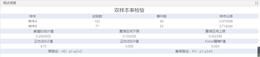 使用雙樣本率檢驗(yàn)組件可執(zhí)行確定兩個(gè)組的總體比率是否不同和計(jì)算可能包括總體比率之間差值的值范圍。