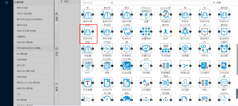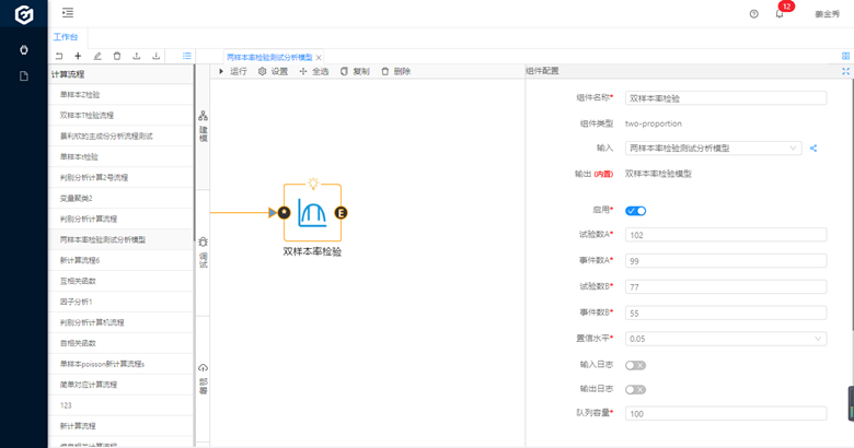 采用拖取的形式從數(shù)據(jù)大腦中的組件面板查找雙樣本率檢驗(yàn)組件,拖到到工作面板。