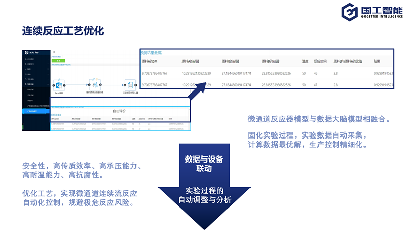 根據生產和質量數據,人工智能系統會直接計算最優的收益率,最優原材料配比,最優的反應時間、溫度并給出最優工藝參數建議。同時系統可以反向控制相關反應設備,形成優化閉環。