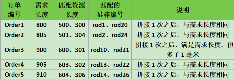 舉個例子,有50 個需求,倉庫中有1000個原料,要在材質,規(guī)格,長度需求上滿足需求,可拼接,但是每個硅棒需求最多允許拼接2次,可以超長,但是超長的部分不可超過50mm,超長的部分越少越好。