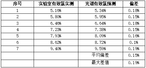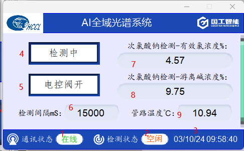 圖中圈1的地方為手動閥,當打開其中一個手動閥,物料即流經管道,接著打開電磁閥(圈2)物料先經過Y型過濾器(圈3),再經過視盅(圈6),然后充滿光譜儀(圈4)一直流經至取樣口(圈5),打開取樣口進行取樣送檢,同時光譜儀開始檢測,當實驗室檢測結果出來后,我們將同批次光譜檢測的物料有效氯的含量參數和游離堿的含量參數進行標定,以此類推,進行大量取樣檢測標定過程。檢測結果在光譜控制柜(圈7)上直接顯示。